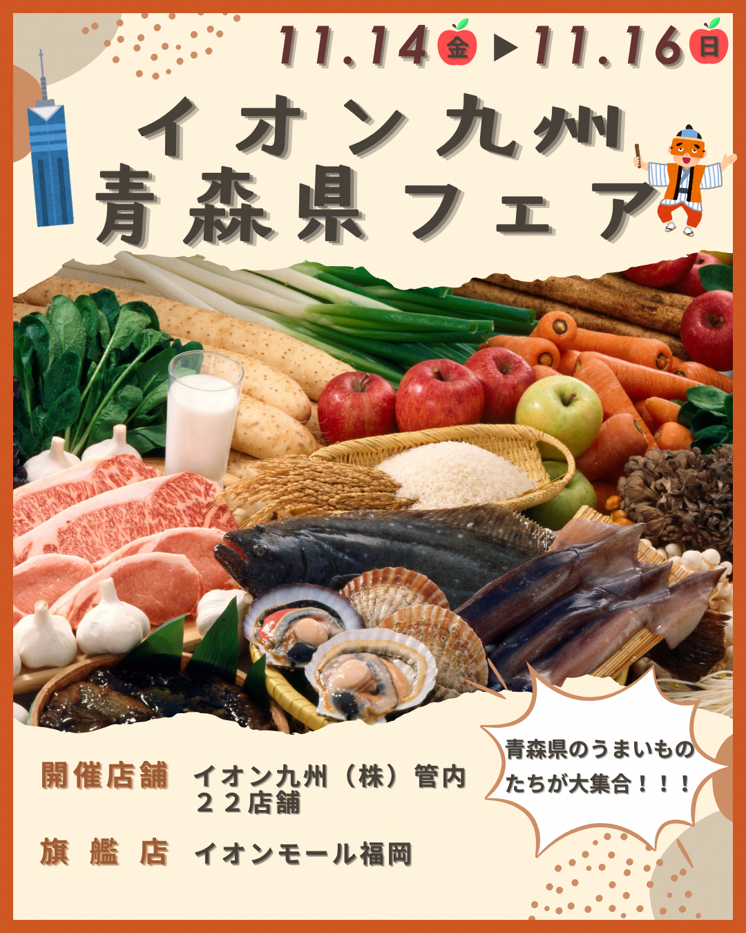 令和7年11月14日(金)から11月16日(日)までの3日間、イオン九州株式会社管内22店舗において、「青森県フェア」が開催されます!