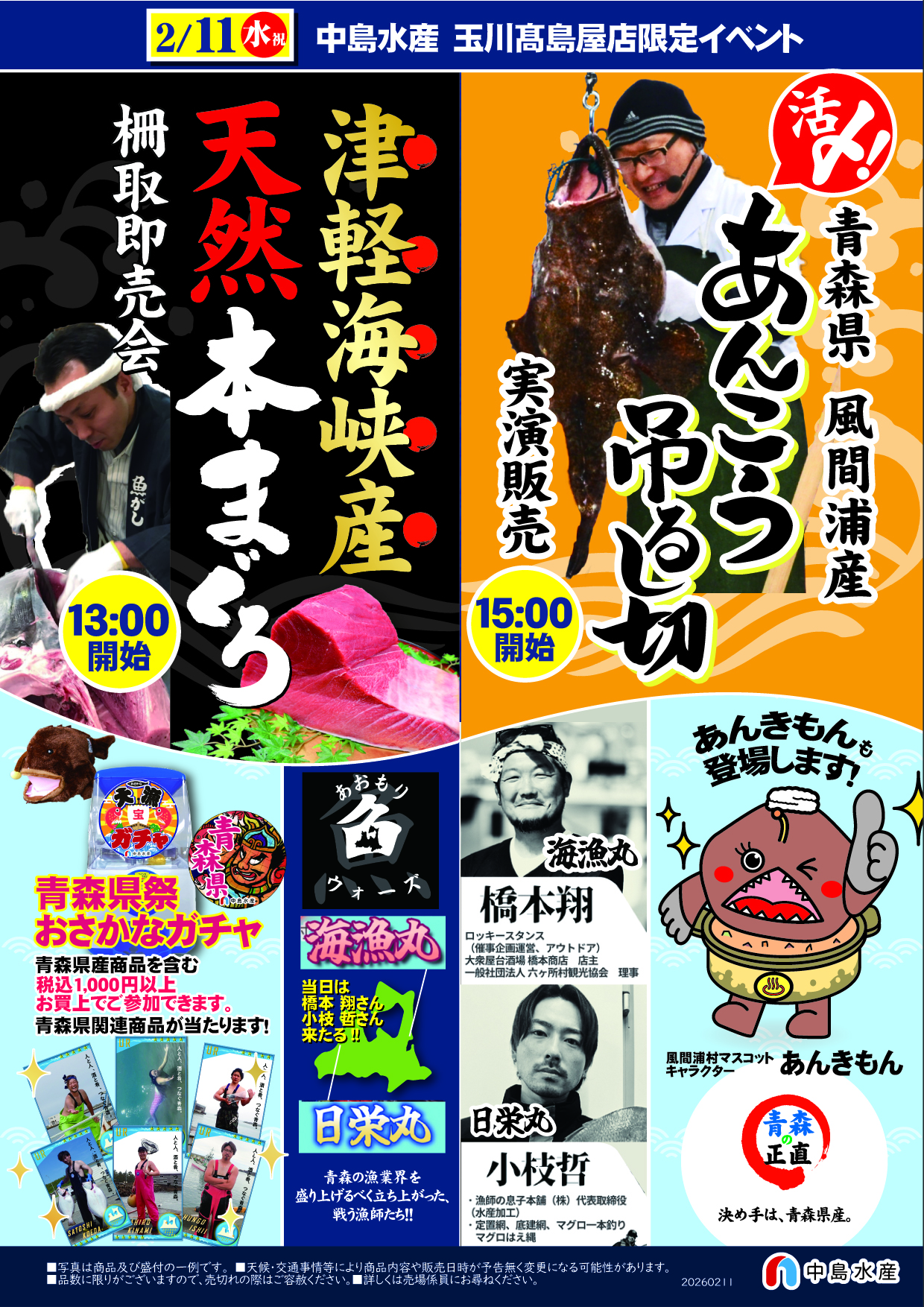 令和8年2月11日(水祝)から14日(土)までの4日間、百貨店等を中心に魚介類を販売している中島水産において、「青森県祭(青森県フェア)」を開催します。