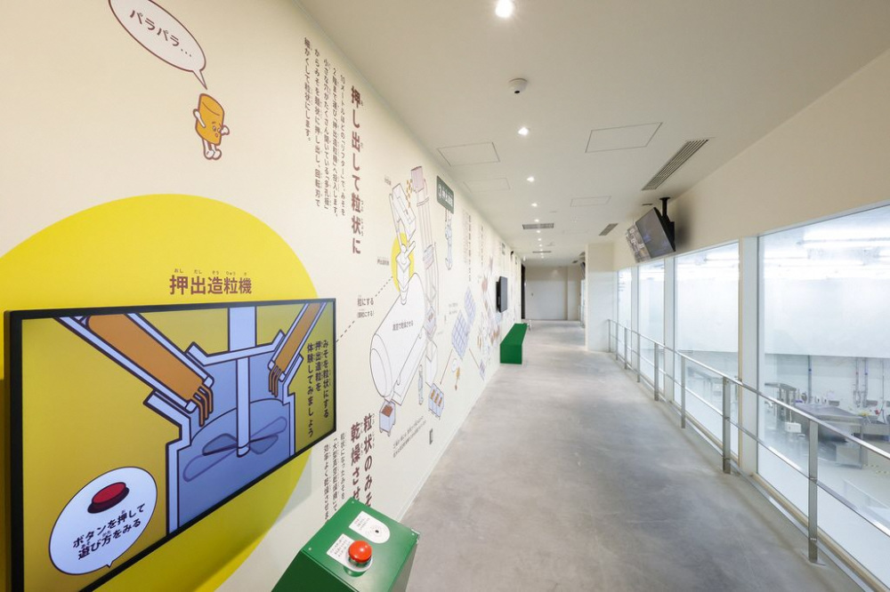 顆粒みそ生産ラインをガラス越しに見学できる通路が設けられていて、独自製法の技術をゲーム感覚で学ぶことができるなど、子どもから大人まで、みんなが楽しめる工夫が盛りだくさんです。