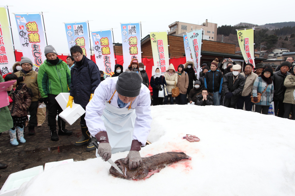 風間浦村では毎年「風間浦鮟鱇まつり」というお祭りが開催されます!そのお祭りの期間中には、下風呂漁港内特設会場で「風間浦鮟鱇感謝祭」が開催されるそうです。感謝祭では、生きたアンコウや、伝統的な捌き方である「雪中切り・吊るし切り」の実演を見ることができます。もちろん!おいしいアンコウをお寿司や味噌汁で楽しむこともできますよ。