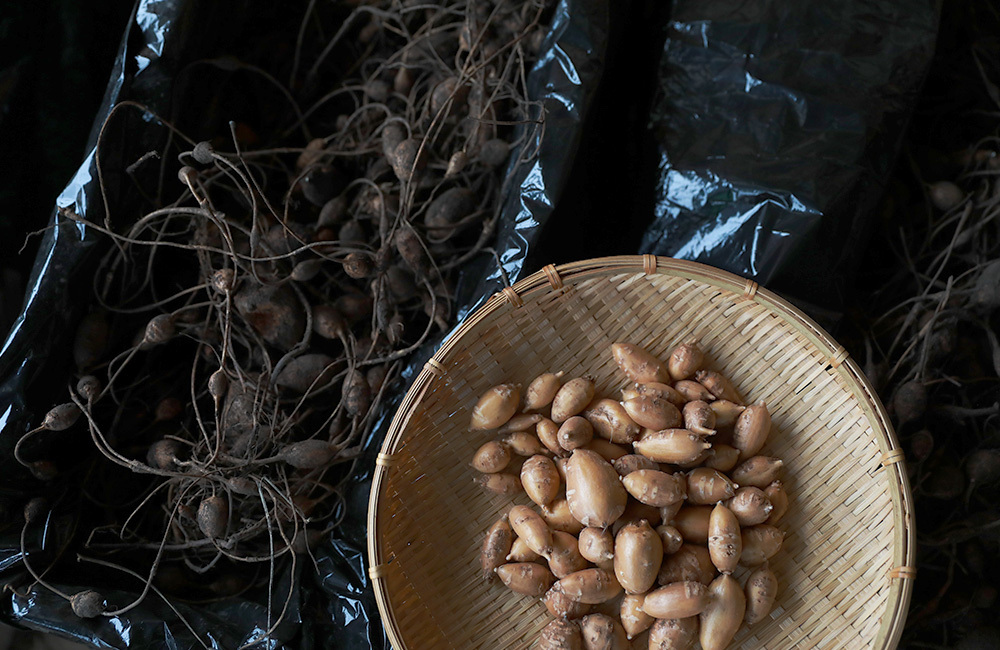 鉄分、食物繊維、タンパク質やカルシウムが豊富に含まれ、さらに、イモ類には珍しいビタミンEやビタミンCも含まれているという、まさに「奇跡の野菜」がアピオスです。 北米原産のマメ科の植物で、アメリカの先住民族が「戦闘食」として食べていたほど、少量でも高い栄養価が期待できます。地元・青森では「ほどいも」とも呼ばれ、JAゆうき青森などでは安心・安全に大切に育てられています。7月から9月にかけては、スミレに似た濃厚な香りを持つ、深い紫色の蝶のような美しい花を咲かせます。